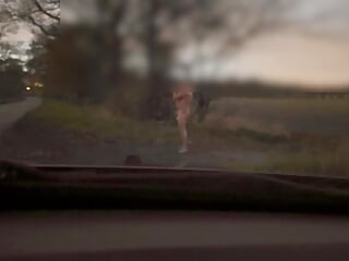 黄昏危险的公共裸体,在车经过时被困在外面裸体