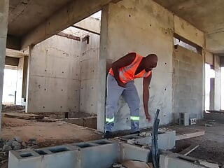 建筑工地的大量射精。年轻工人撸管他的大鸡巴射精,几乎被抓到