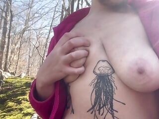 Ftm赤裸上身徒步旅行:在苔树林里的乳房玩