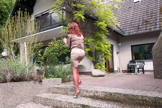 Crossdresser 穿着缎面和完全成型的丝袜高潮。